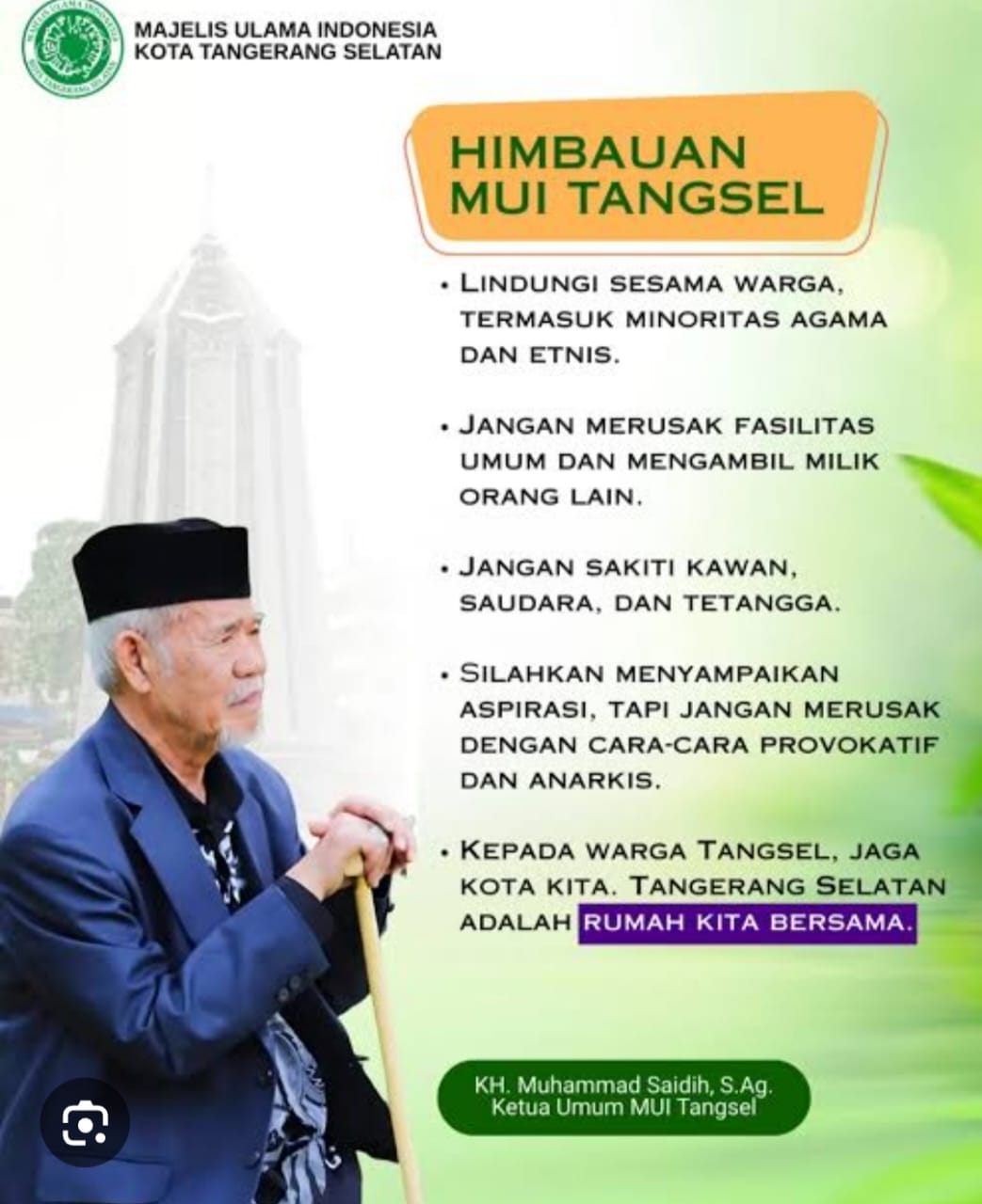 Dalam Himbauannya, Ketua MUI Tangerang Selatan Kyai Saidih menyampaikan sekaligus meminta beberapa hal yaitu :